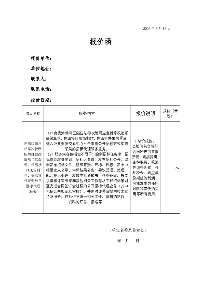 勃灣區(qū)隔壓站零次管網(wǎng)應(yīng)急維修改造項目保溫管、保溫接口現(xiàn)場制作、保溫管件采購項目招標(biāo)代理服務(wù)【招標(biāo)公告】